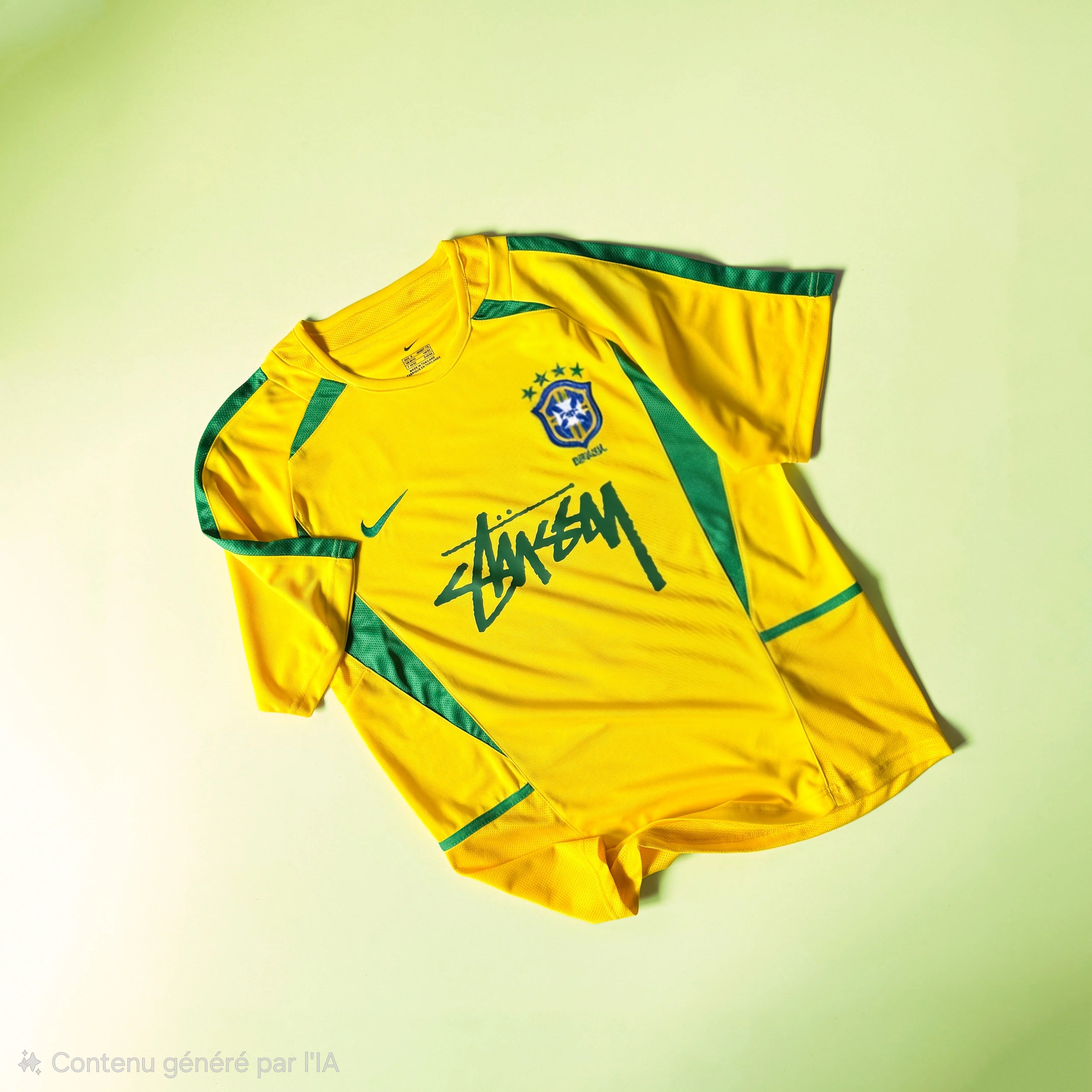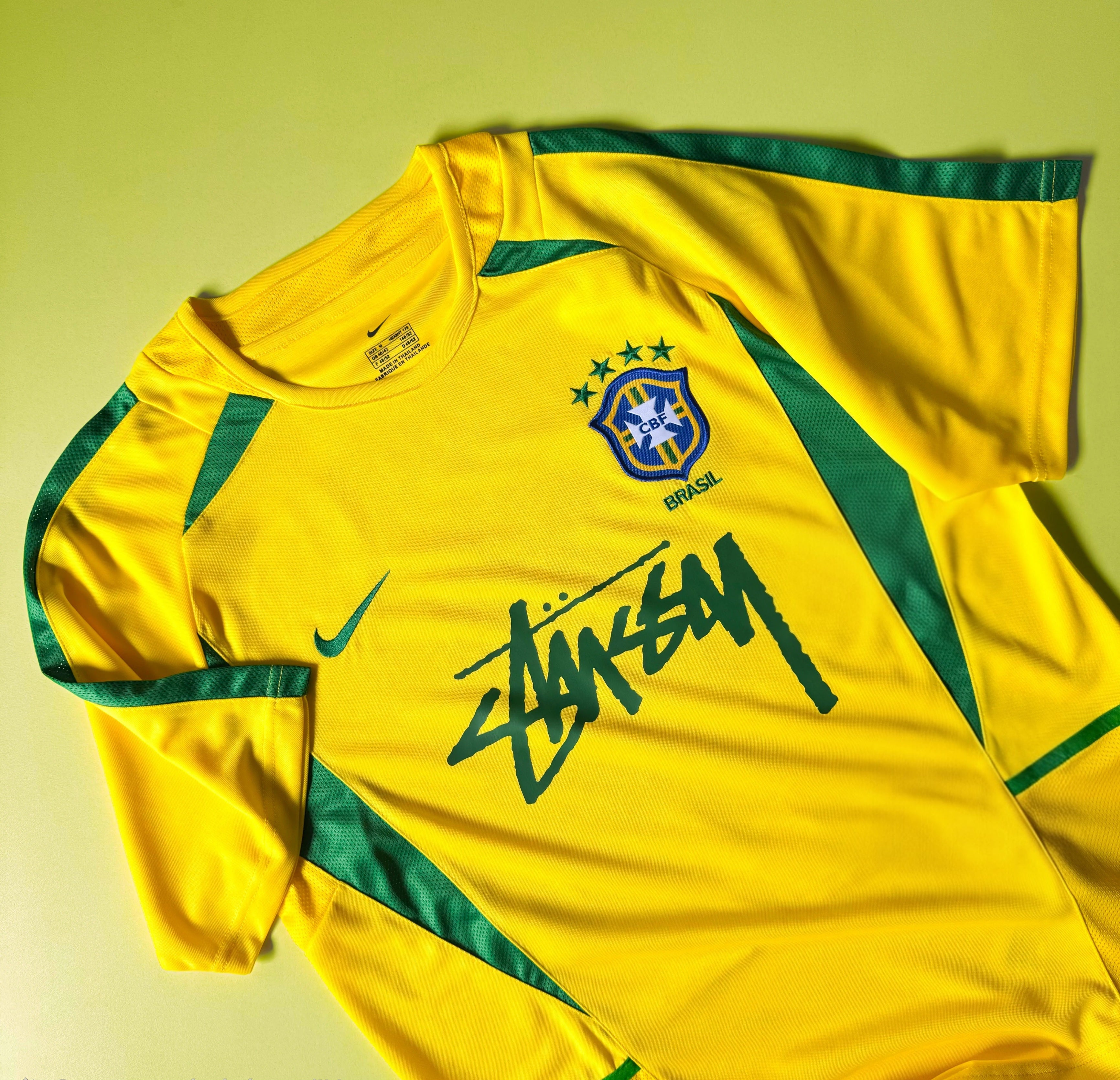 Ce maillot Stüssy x Brésil 2002 rend hommage à la magie du football brésilien — celle de Ronaldo, Rivaldo et Ronaldinho — tout en y ajoutant la touche street iconique de Stüssy.