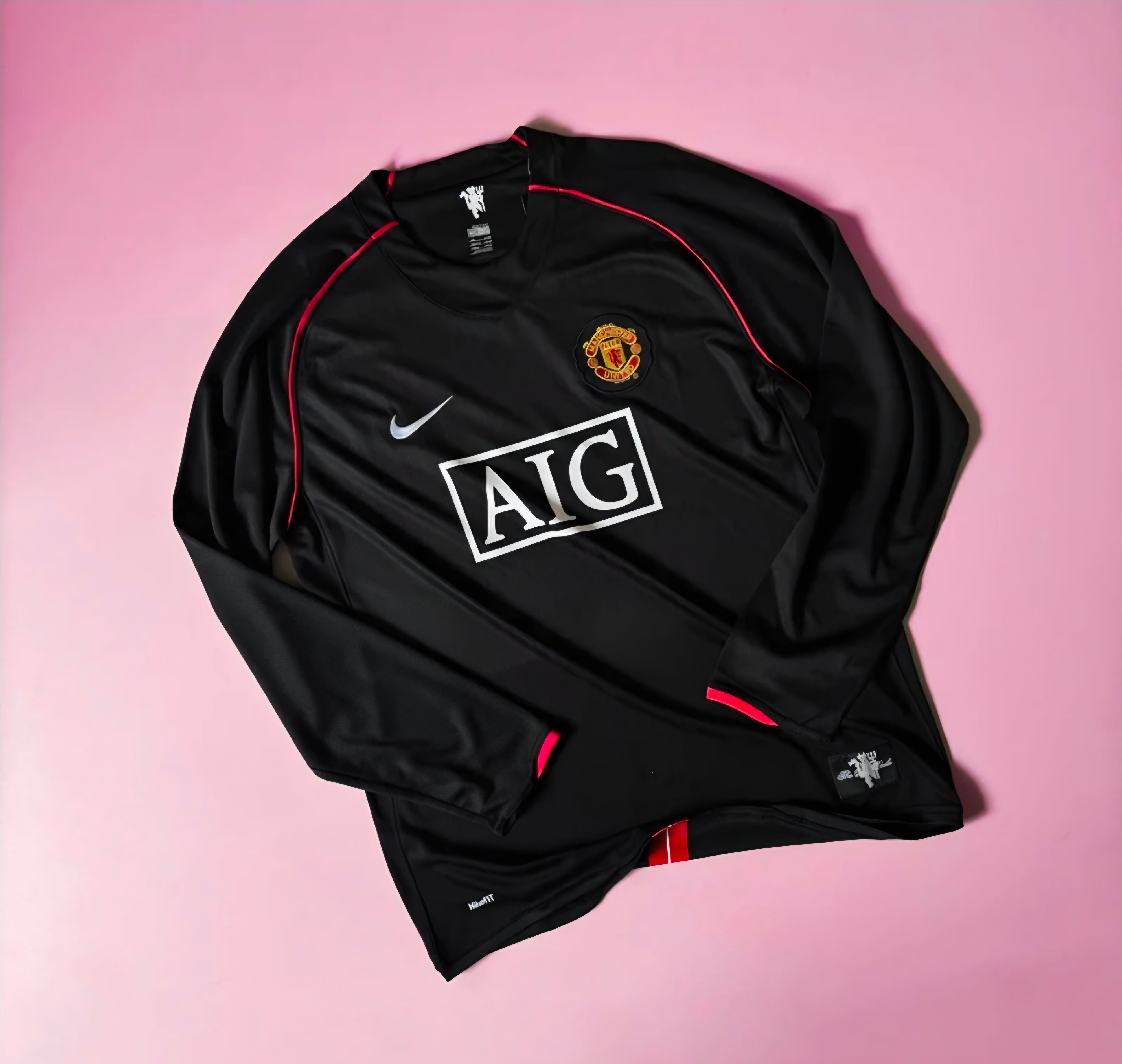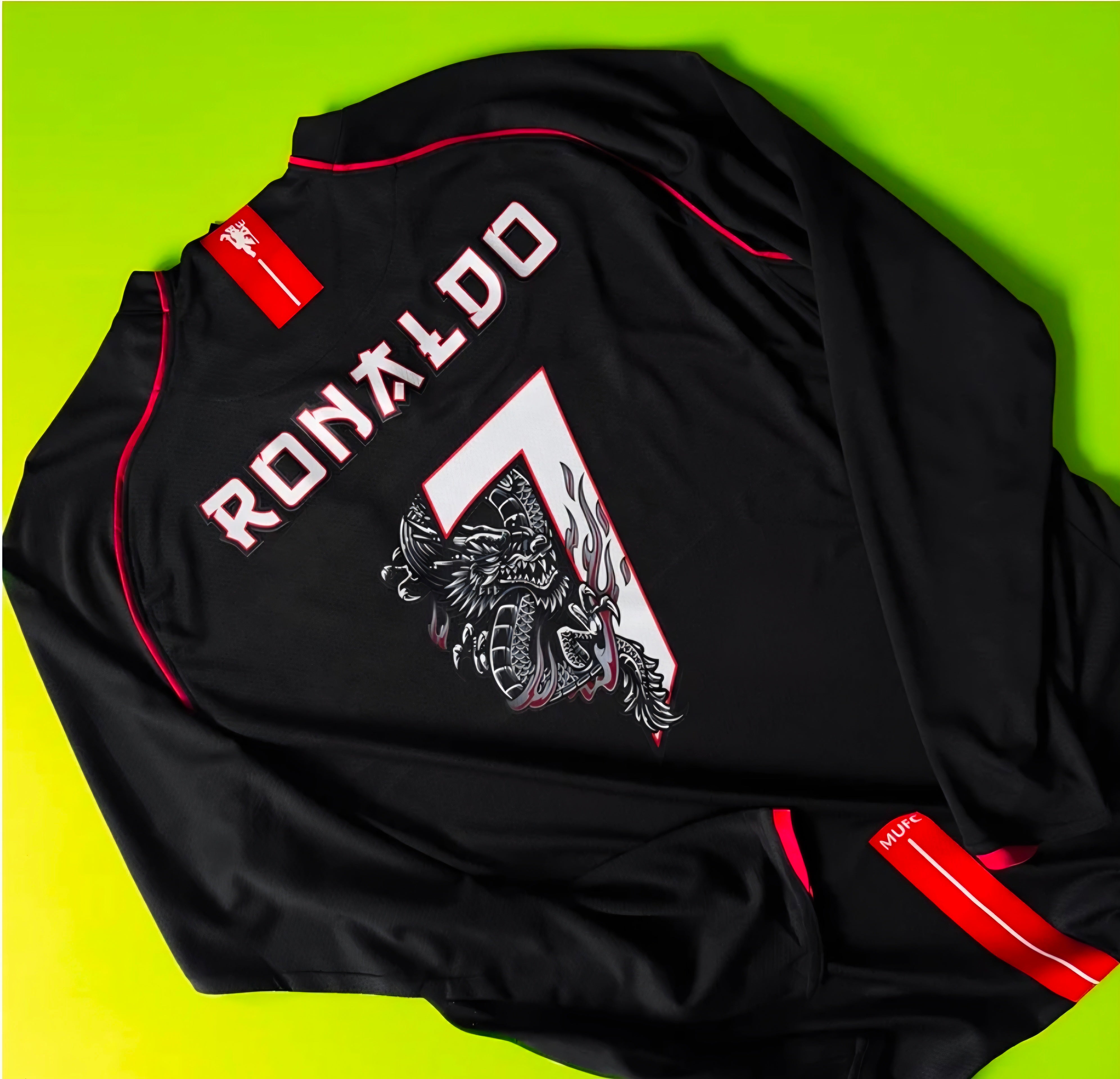 Ce maillot Manchester United Away 2007/08 à manches longues revisité en édition “Flame Dragon” célèbre la saison mythique où la flamme rouge a conquis l’Europe.