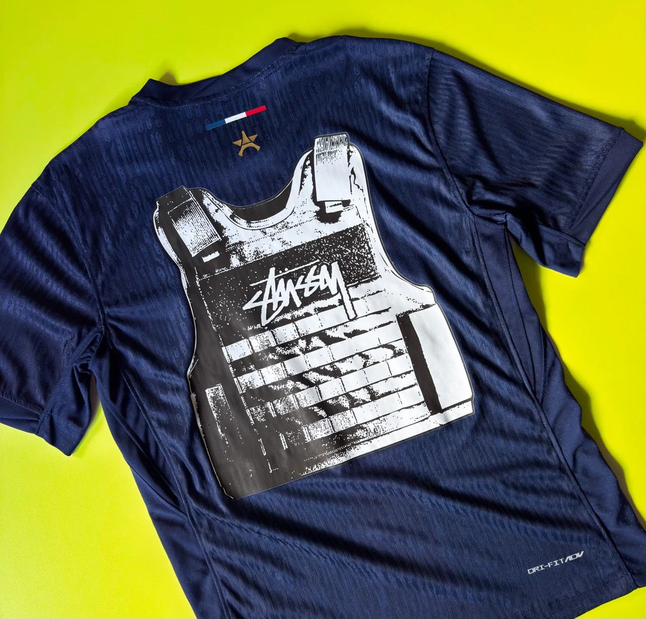 Inspiré par la collaboration entre Stüssy et l’esprit bulletproof, ce maillot PSG édition spéciale “Blue” casse les codes du football classique.